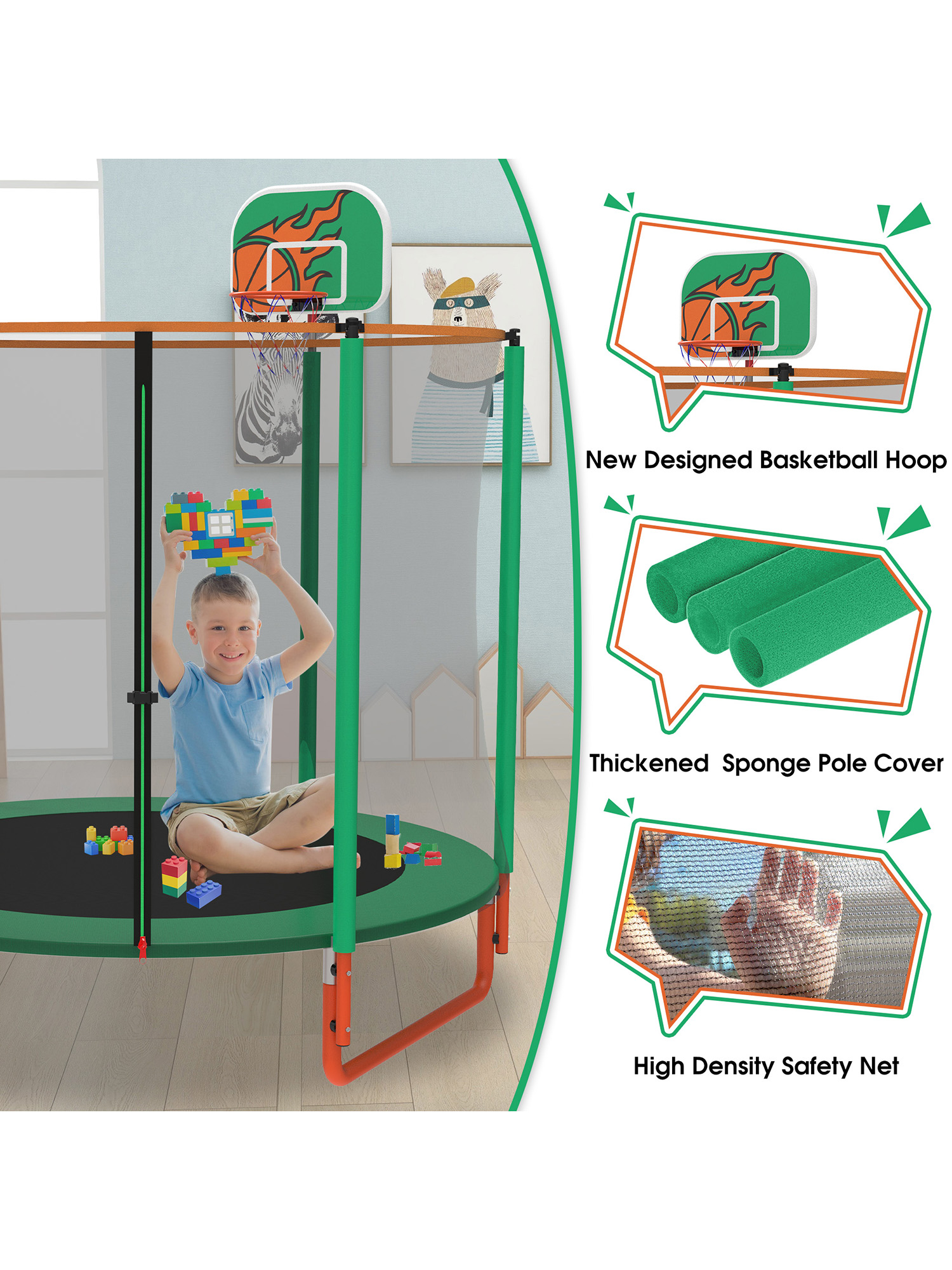 Strong & Steady Structure: The 5.4ft high, 360-degree enclosure net, made of high-density, eco-friendly PE material, provides complete safety coverage during play. A double-lock zipper and safety buckle offer added childproof protection, keeping kids secure inside while jumping. The safety net poles are wrapped with 10mm thick foam padding, effectively preventing injuries caused by accidental collisions. Each leg features a full-area ground contact design, offering greater stability and balance compared to traditional two-point touchdown legs. This upgraded structure minimizes tipping risks and ensures a sturdier, safer jumping experience — even during energetic play.