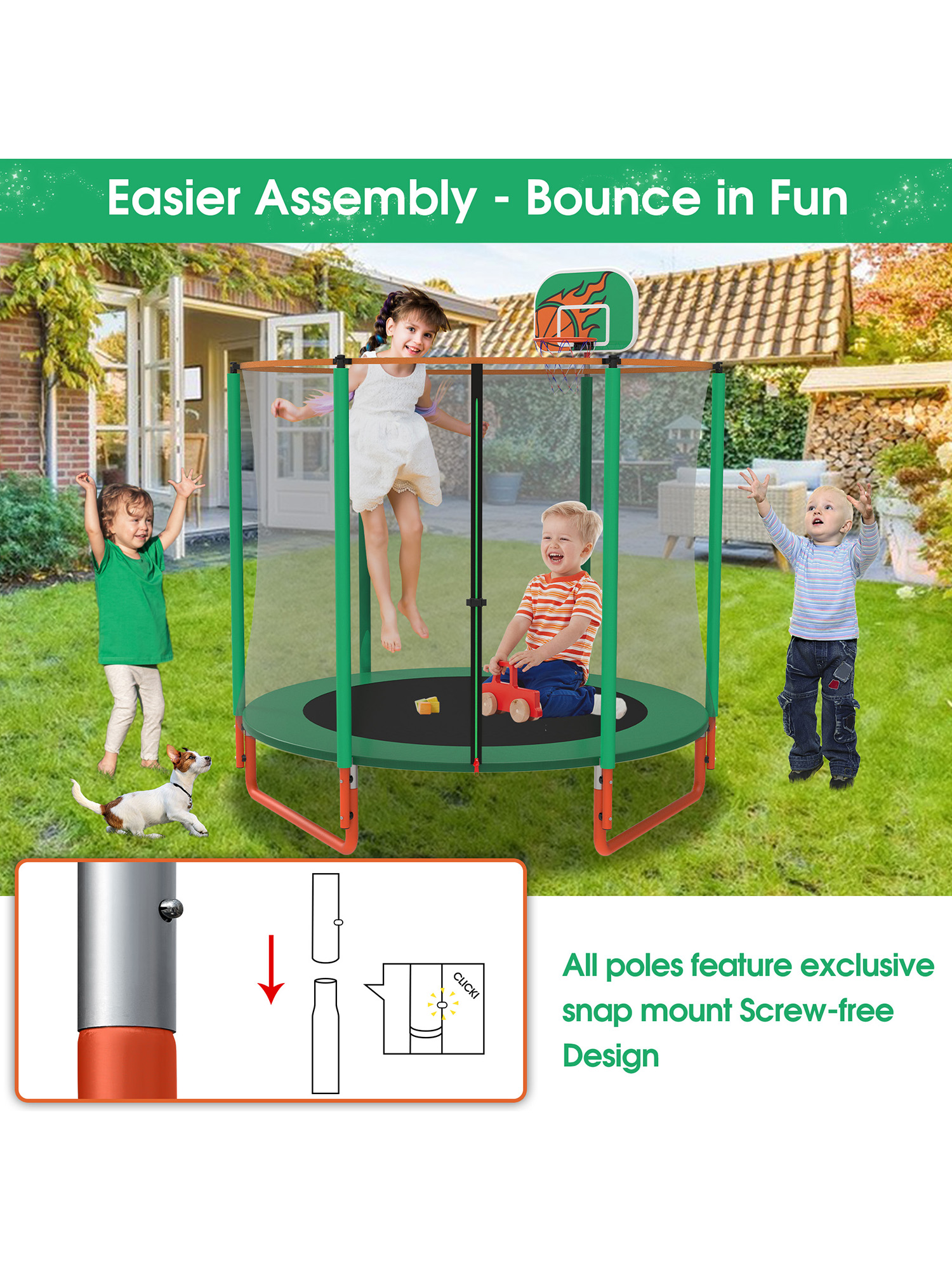 Easy to Assemble & Professional Service Team: Assembling your trampoline is fast and straightforward, thanks to a clear, detailed instruction manual and two spring-loading tools for faster setup. With two adults, assembly can be completed in just about 1 hour. The trampoline features screw-fixed connections between the legs and poles for added frame stability, while all other parts use quick-release joints for effortless installation and takedown. This smart hybrid design combines strength with convenience. offers a 30-day money-back guarantee, an 24-month warranty, and attentive customer service, ensuring a worry-free experience from start to finish.